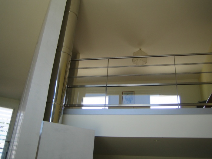 Le traitement des espaces intérieurs, utilisant une expression architecturale contemporaine, fait une large part aux espaces ouverts, ménageant des vues depuis les différentes pièces sur l’espace de vie central, conçu comme le cœur de la maison avec ses escaliers et sa cheminée.